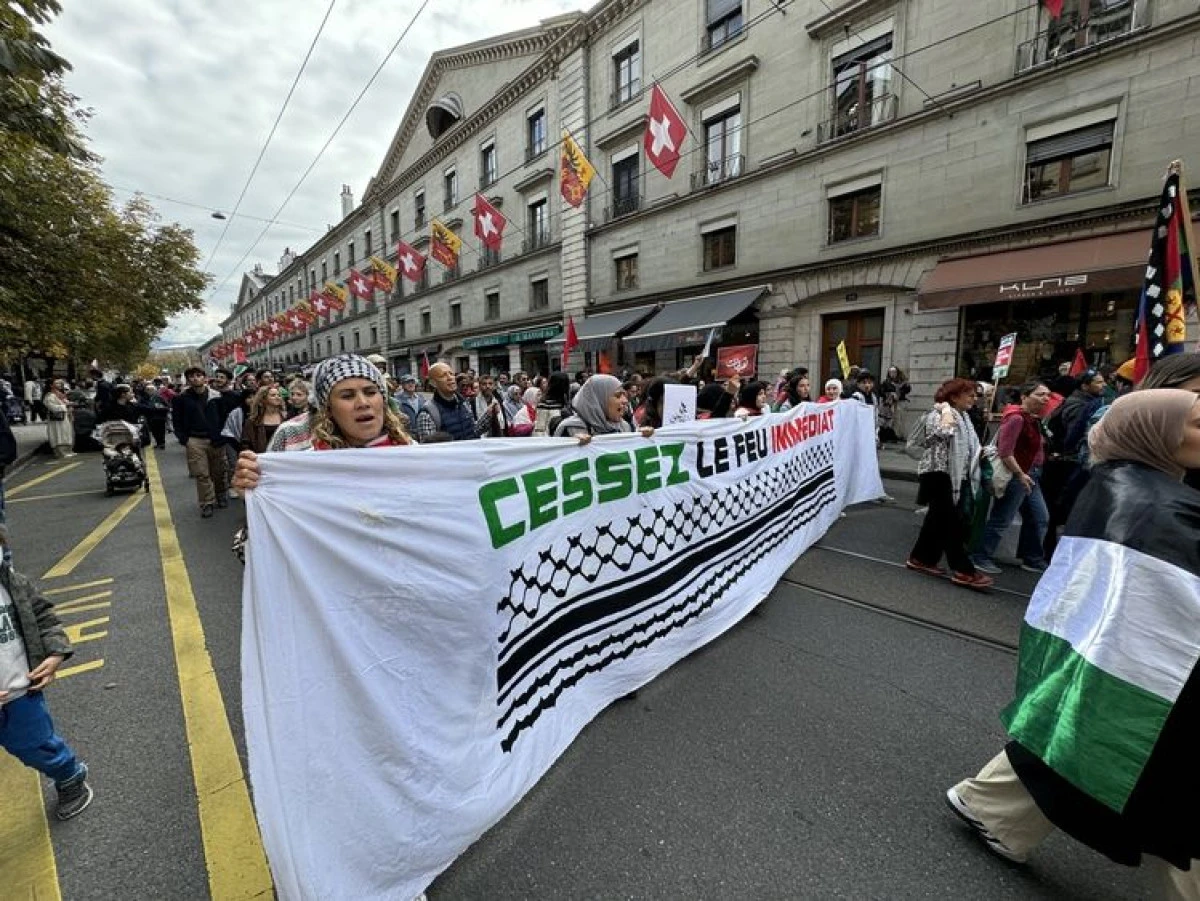Cenevre'nin Place Neuve Meydanı'nda toplanan binlerce kişi, şehir merkezinde saatlerce yürüdü. Ellerinde Filistin haberleri">Filistin bayrakları ve Filistin'e destek içeren dövizler taşıyan eylemciler, İsrail haberleri">İsrail'e yaptırım uygulanması için ülkelere çağrıda bulundu. Fransızca, İngilizce ve Arapça İsrail karşıtı sloganlar atan göstericiler, Gazze'de yaşanan soykırıma tepki gösterdi. Eylemciler, başta ABD olmak üzere İsrail'e destek olan ülkeleri yaşanan soykırıma ortak olmakla suçladı. Yoğun güvenlik önlemi altında yaklaşık 3 saat süren yürüyüş, Parc Des Cropettes Meydanı'nda son buldu. Yürüyüş sırasında herhangi bir olay veya taşkınlık yaşanmadı.