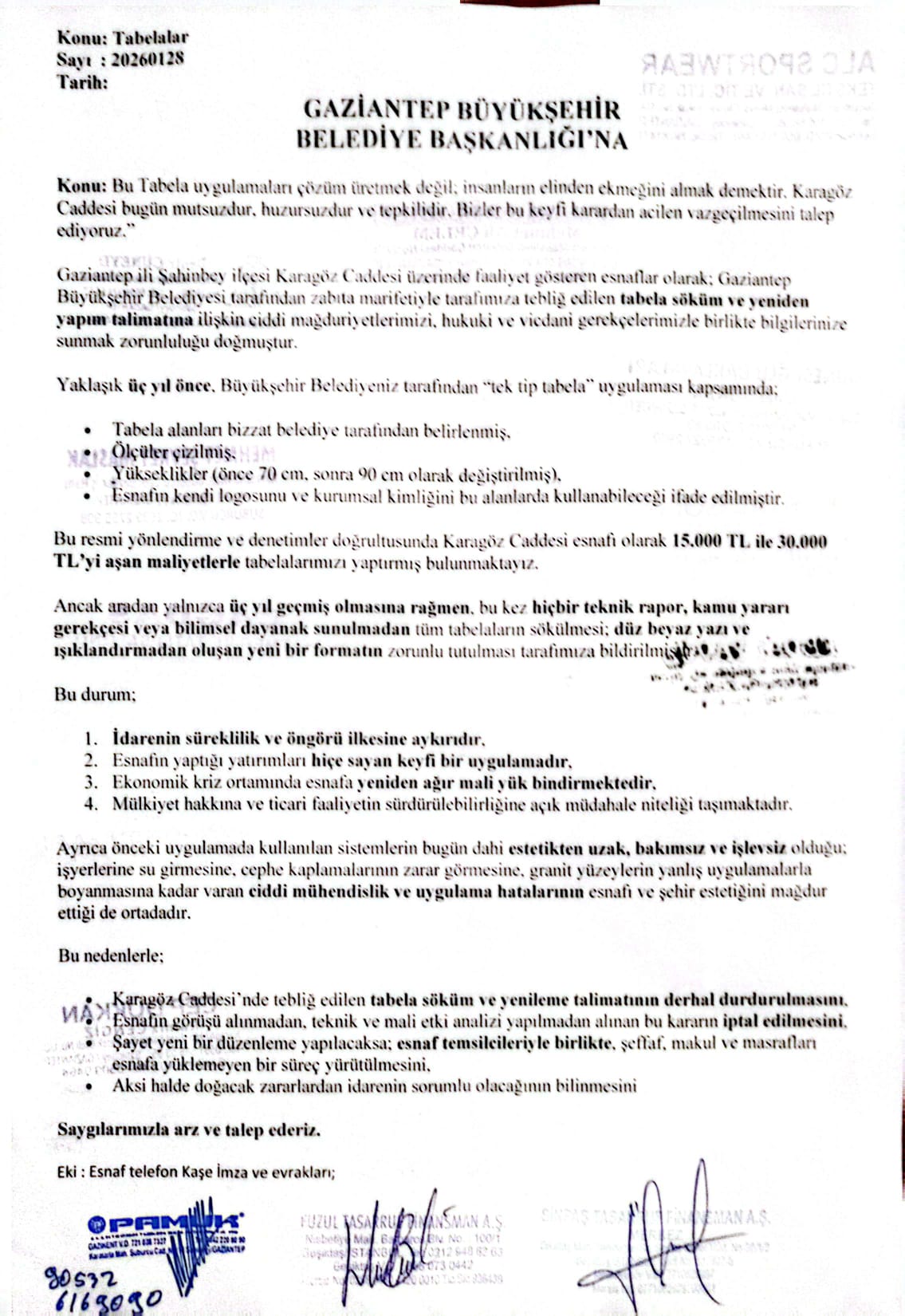 Pamuk, Karagöz Caddesi esnafı olarak imza toplama sürecininde sembolik te olsa 36 firmanın kaşeleyerek imza attığı itiraz dilekçesini, Evrak no:12360 29/01/2026 tarih itibarı ile taleplerini doğrudan Gaziantep Büyükşehir Belediyesi’ne iletilettiğini ve konunun takipçisi olacaklarını, Meslek odalarının da, üyelerine sahip çıkmaya davet eden Mehmet PAMUK da tüm tarafları sorumluluğa davet ediyorum. Dedi.