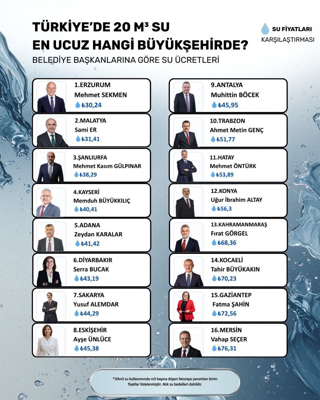 - Güneydoğu Anadolu Kıyaslaması: Şanlıurfa’da aynı miktar suyun birim fiyatı 38,29 TL iken, Gaziantep’te bu bedel yaklaşık %90 daha fazla.