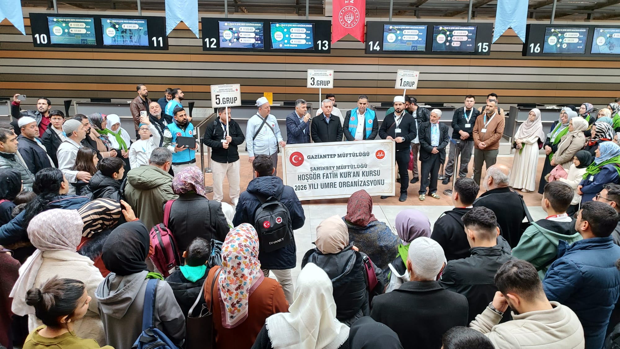 Gaziantep Havalimanı dış hatlar terminali, lebbeyk nidalarıyla bugün tarihi günlerinden birini yaşadı. Hoşgör Kur’an Kurslarımızdan hafızların ve ailelerinin katılımıyla düzenlenen Umre turu için terminal binasında özel bir program icra edildi.