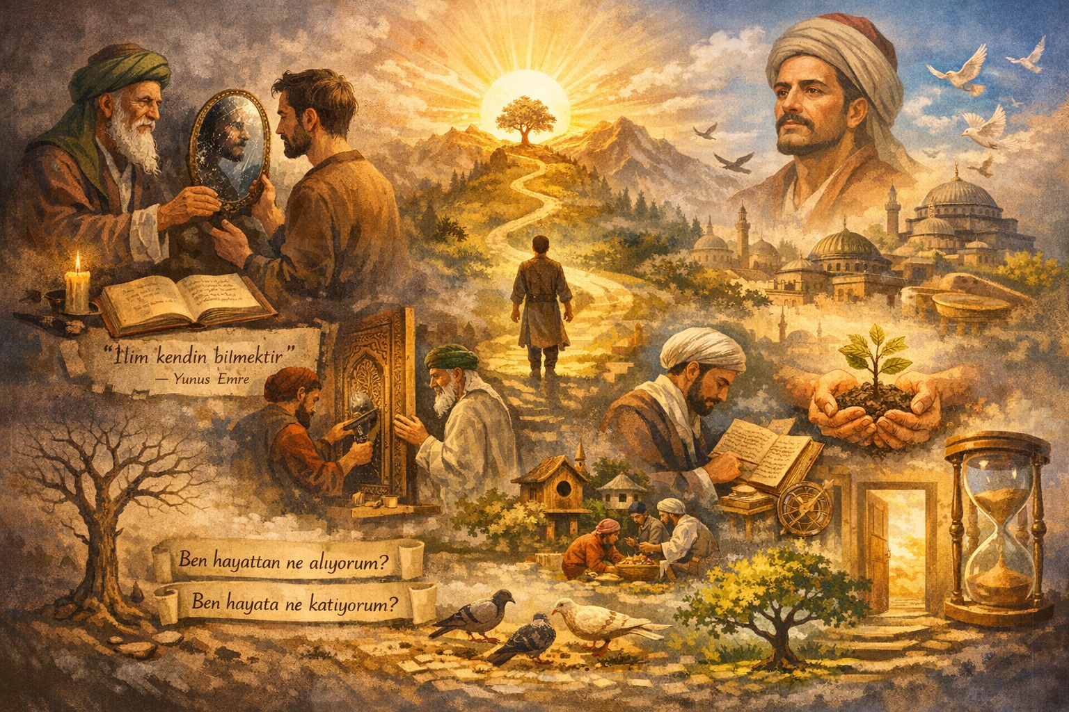 Bizim medeniyetimizde bu hakikat, asırlar boyunca farklı şekillerde dile getirilmiştir. Yunus Emre’nin sade ama derin sözlerinde bu mana arayışının izlerini açıkça görürüz. Yunus, dış dünyayı fethetmekten çok iç dünyayı imar etmeyi öğütler. Çünkü anlam, dışarıda bulunacak bir şey değil; içeride keşfedilecek bir hakikattir.