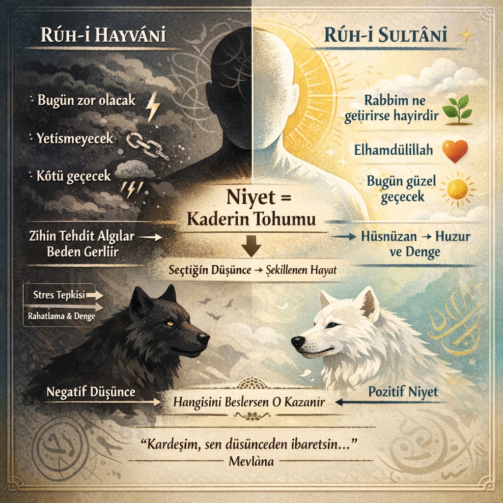 İşte zihin muhafızlığı, o beyaz kurdu, yani Rûh-i Sultânîyi besleme sanatıdır. Eğer zihnini suizanla (kötü zan), endişeyle ve negatif beklentilerle beslersen, hayvani ruhun o karanlık pençesi karakterini esir alır.