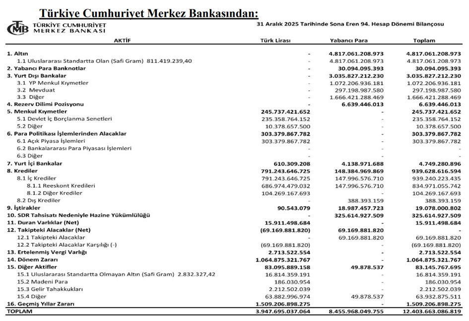 Türkiye Cumhuriyet Merkez Bankası'nın (TCMB) merakla beklenen 94. hesap dönemine ait o kritik bilanço Resmi Gazete'de yayımlanarak gün yüzüne çıktı. 2025 yılı sonu itibarıyla kurumun aktif toplamının 12 trilyon 403 milyar lira düzeyine ulaştığı kaydedildi. Kasanın en büyük güvencesi olan altın mevcudunun ise 4 trilyon 817 milyar lira olarak kayıtlara geçtiği ifade edildi.