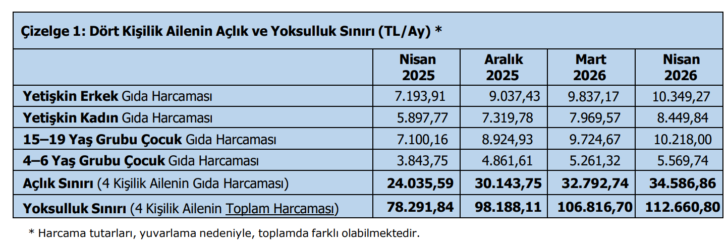Türk-İş’in nisan ayı verilerine göre dört kişilik bir ailenin yoksulluk sınırı 112 bin 661 TL’ye ulaşırken, açlık sınırı da 34 bin 587 TL seviyesine yükseldi.