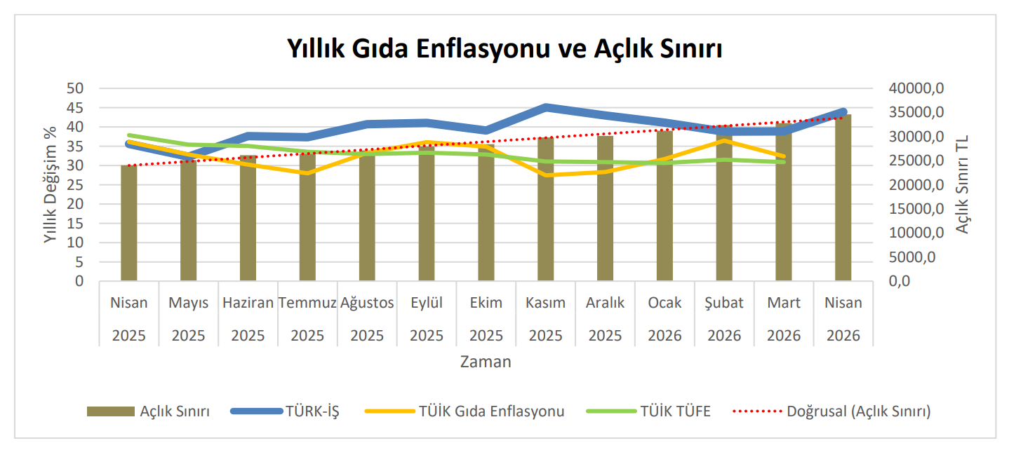 Mutfaktaki yangın nisan ayında da sönmedi; Türk-İş’in her ay düzenli olarak paylaştığı "Açlık ve Yoksulluk Sınırı" araştırması, geçim derdinin ne boyuta ulaştığını bir kez daha gözler önüne serdi. Ankara’da yaşayan dört kişilik bir ailenin sağlıklı beslenebilmesi için cebinden çıkması gereken gıda harcaması, nisan ayı itibarıyla barajı aşarak 34 bin liranın üzerine çıktı. Vatandaşın alım gücü her geçen gün erirken, temel ihtiyaçları kapsayan yoksulluk sınırı rakamları ise altı haneli seviyelerdeki tırmanışını sürdürüyor.