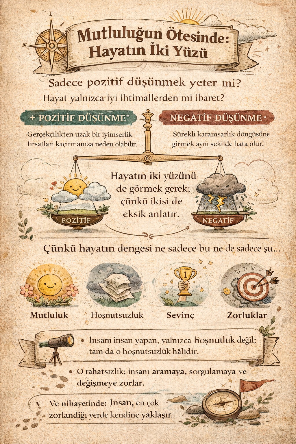Mutluluk dediğimiz şey, tek başına bir hedef değil; bir denge hâlidir. İçinde hem aydınlık hem karanlık vardır. Sadece iyi olanı isteyen bir bakış, hayatın yarısını görmezden gelir.
