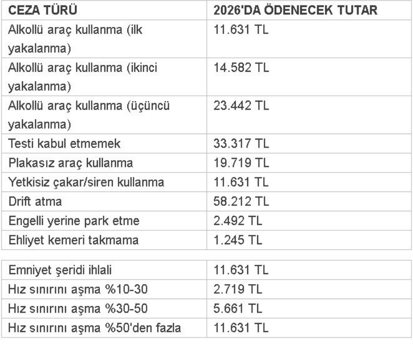 2026 yılında emniyet kemeri takmama, takip mesafesine uymama, trafik sigortası olmadan trafiğe çıkma, kask takmadan motosiklet kullanma ve geçiş hakkı vermeme gibi ihlaller için uygulanan en düşük trafik cezasının bedeli 993 TL'den 1.246 TL'ye yükseltilecek.