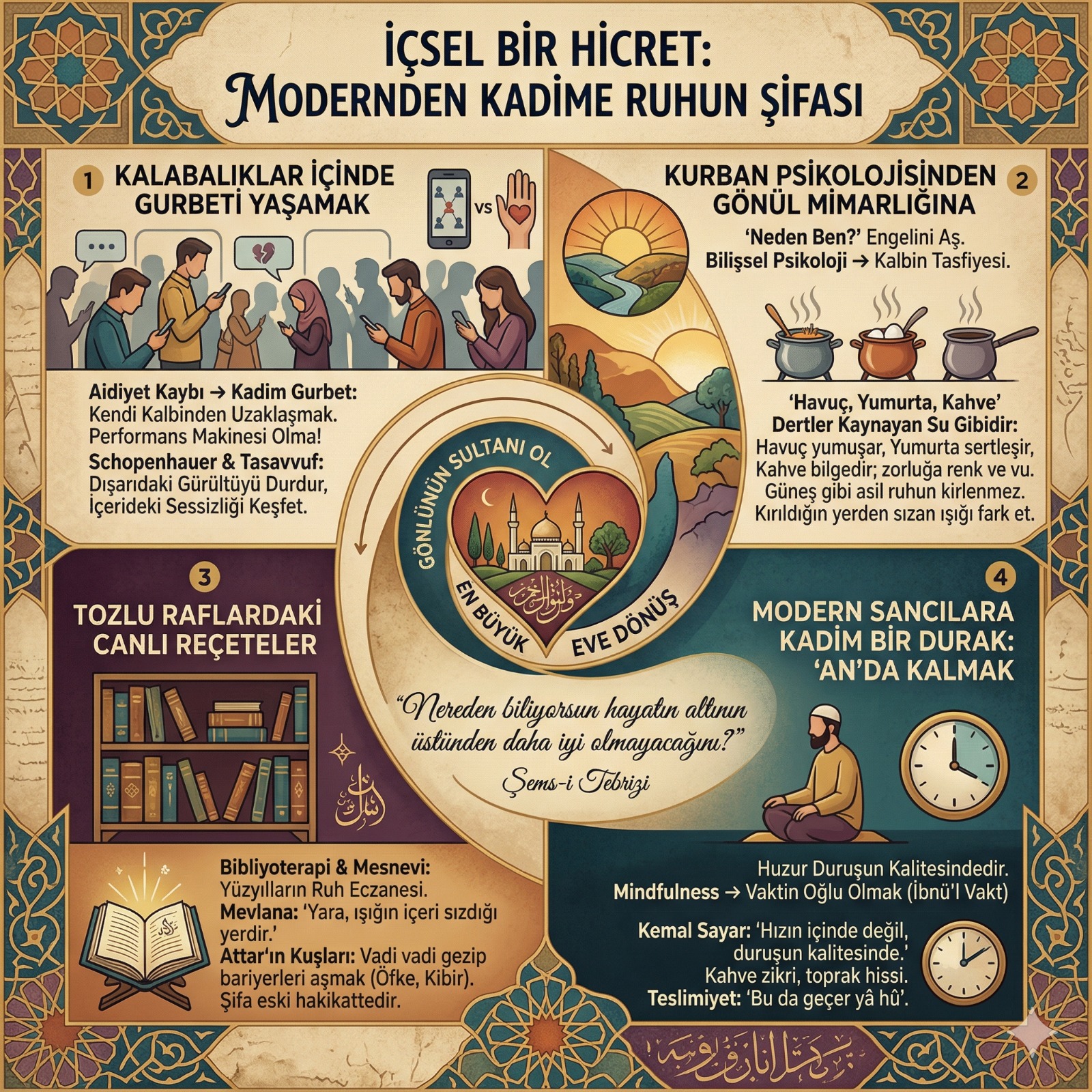 Bir fincan kahveyi içerken sadece o kahvenin kokusuna odaklanmak, yürürken bastığımız toprağı hissetmek... Bunlar sadece basit egzersizler değil, birer zikirdir. Modern terapi odalarında aradığımız o büyük huzur, aslında bir dervişin "Bu da geçer yâ hû" levhasındaki o derin teslimiyette gizli. Sorunları yok saymıyoruz, sadece onların "gelip geçiciliğini" kabul ederek ruhumuzun o fırtınadan etkilenmeyen merkezine sığınıyoruz.