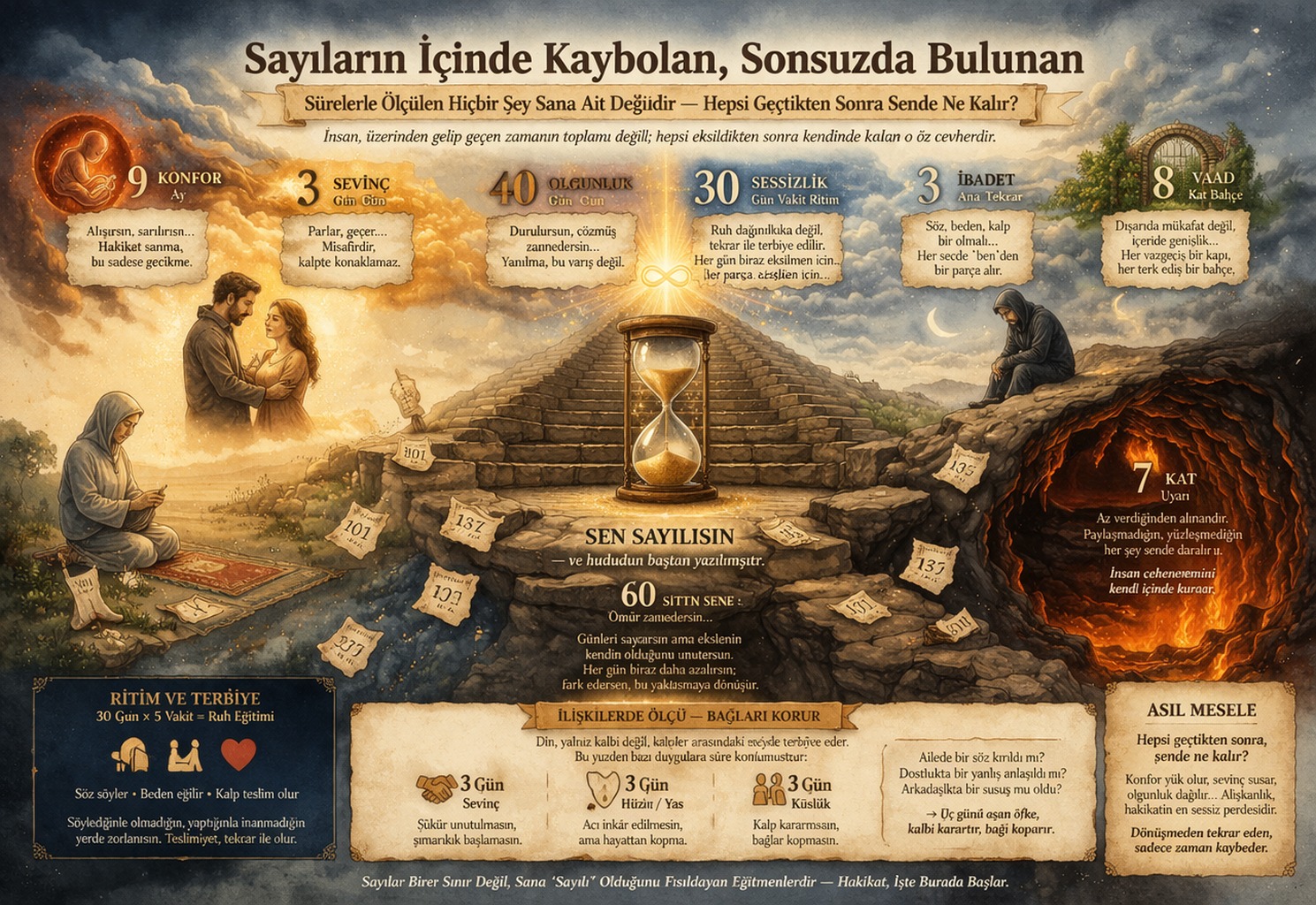 Sayılar sadece birer sınır değil, insana “sayılı” olduğunu fısıldayan ve onu sonsuzu aramaya iten sessiz birer eğitmendir. İşte hakikat tam burada başlar. Sürelerle ölçülen hiçbir şey sana ait değildir. Ne konfor, ne sevinç, ne olgunluk, ne ibadetin ritmi, ne de ömrün kendisi…