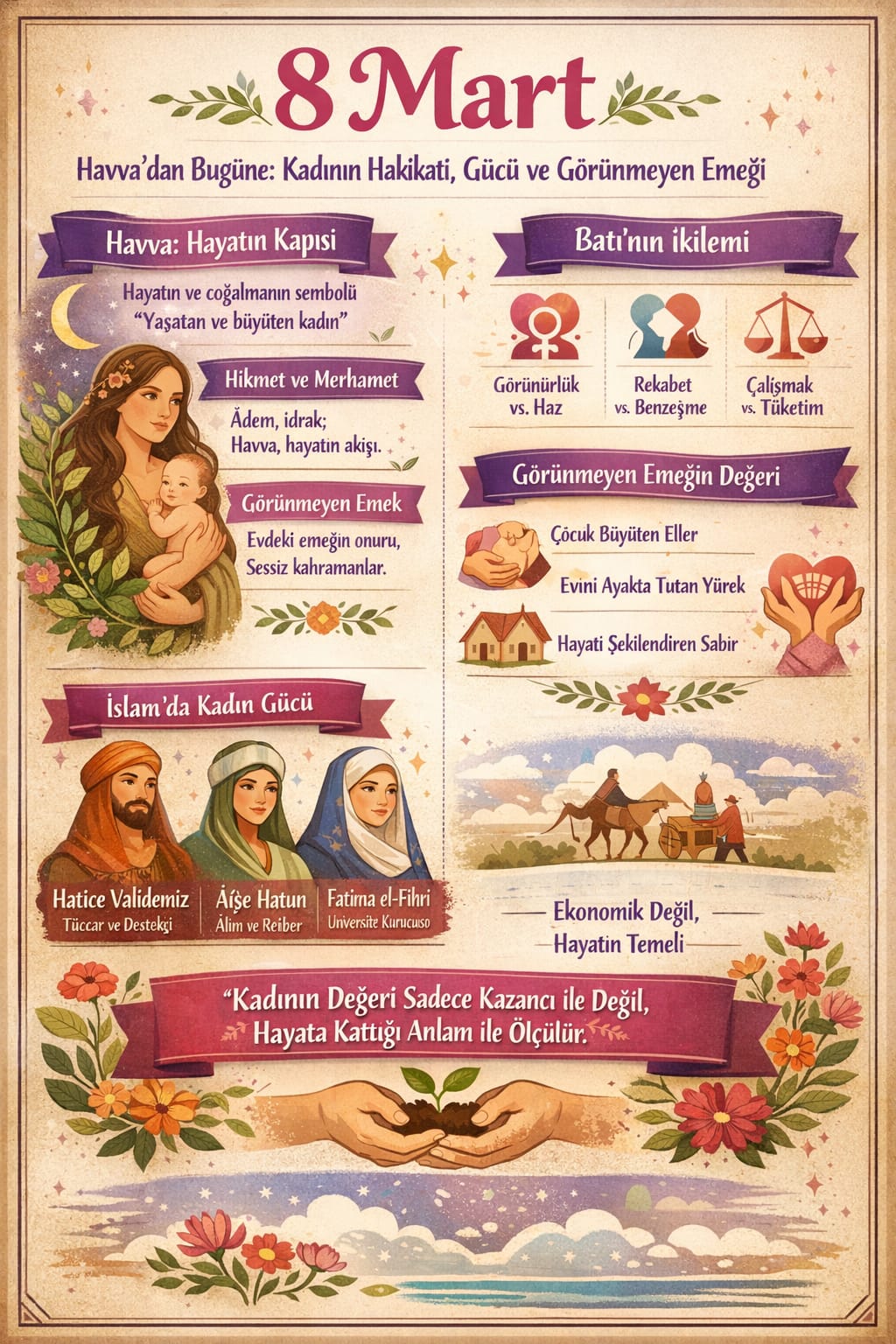 Bu örnekler bize şunu gösterir: Kadının varlığını inşa etmesi bir medeniyet için tehdit değil, berekettir.