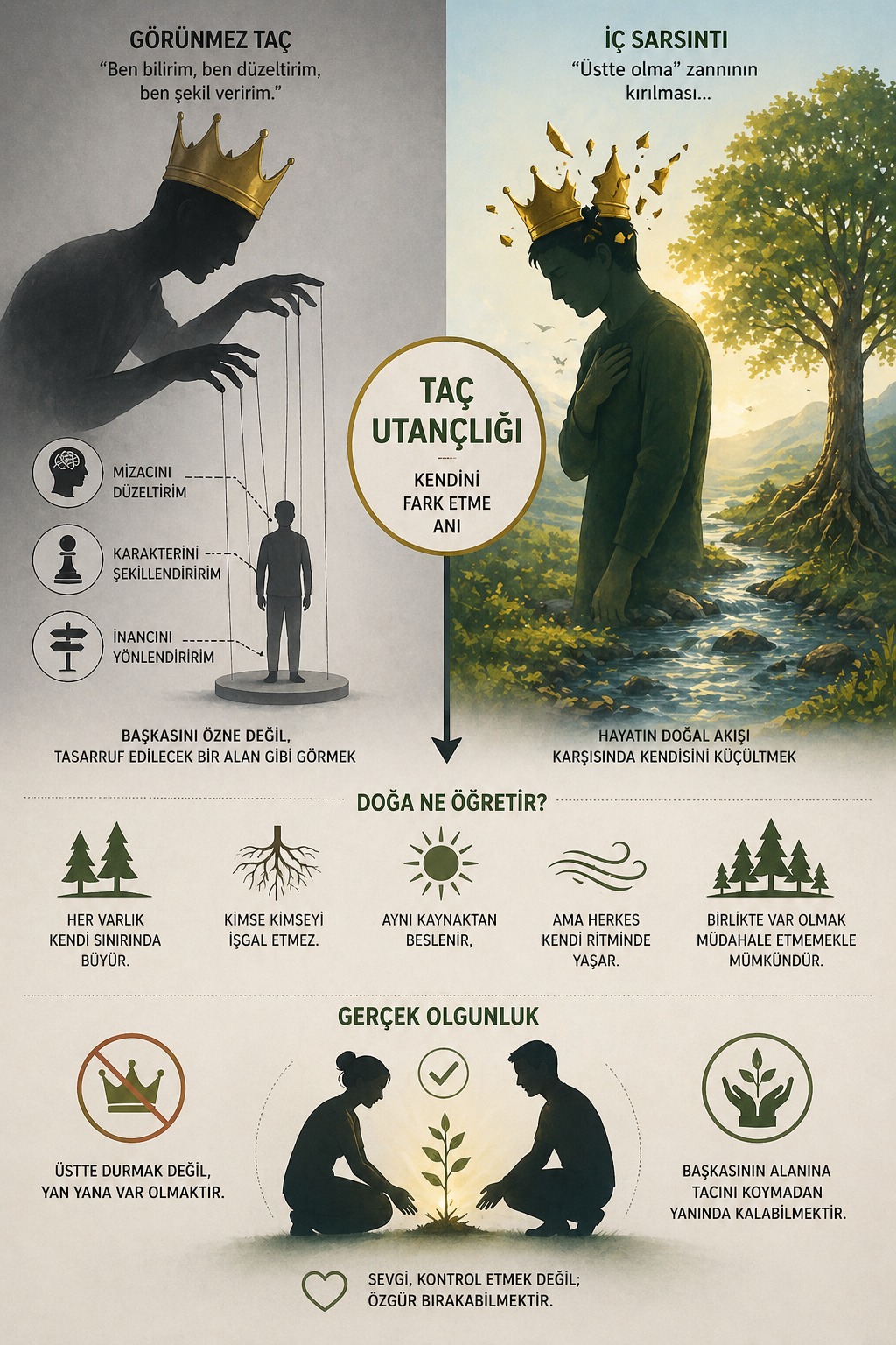 Taç utançlığı, insanın başkasının varoluşunu şekillendirme arzusunu fark ettiğinde yaşadığı derin iç sarsıntıdır; doğanın sınırı bilen sessiz düzenine bakıp kendi müdahale isteğinden utandığı andır. Gerçek olgunluk, üstte durmakta değil yan yana var olmakta saklıdır; başkasını değiştirmeye çalışmadan, olduğu gibi kabul ederek yanında kalabilmektir. Ve belki de bu yüzleşme, insanın en büyük büyümesidir: “ben düzenlerim” dediği her yerde aslında bir dengeyi bozduğunu görmek.